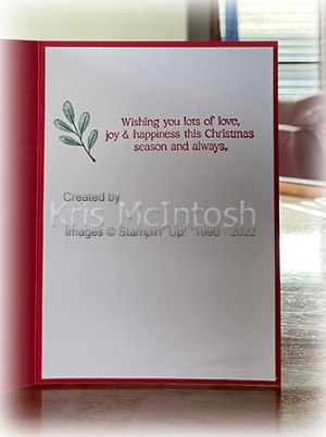 To decorate the inside of the card I stamped another greeting from the Sweet Candy Cane stamp set onto Basic White card using Real Red ink. I also stamped the small leaf image from the same stamp set beside the greeting using Shaded Spruce ink.