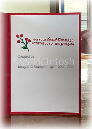 I stamped “Merry Christmas” from the Mistletoe Magic stamp set onto basic White card using Real Red ink and cut it out using my paper snips. The greeting is attached across the bottom of the image panel. To decorate the inside of the card,
