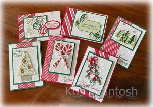 I stamped another greeting from the Mistletoe Magic stamp set onto Basic White card using Real Red ink. I cut the leaf image from Shaded Spruce card using the Mistletoe Dies. I cut Real Red card using the small berry die from the Mistletoe Dies and attached them over the Shaded Spruce image. I love how this turned out, don’t you? Since this is the last card I have to share with you using the panels from the Framed Art Decoration, I thought you might like to see all six cards.