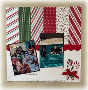 I cut a strip of Real Red card using the border from the Scalloped Contour Dies and attached the pieces across the edge of the Designer Series Paper. The photos on the right page are attached to Early Espresso card to give them a little more definition. I cut two candy canes from the Sweetest Christmas Designer Series Paper using the Candy Cane Die and attached them to the lower right hand corner of the second page.