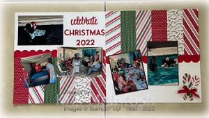 Today’s page shows off some photos taken at our family get together – not Christmas Day but we had lots of fun anyway. Unfortunately the product I am sharing in this project is already retired but hopefully you were lucky enough to get your hands on them while they were available. I attached strips of the Sweetest Christmas 12″ x 12″ Designer Series Paper across the top of one Basic White 12″ x 12″ page and the bottom of another Basic White 12″ x 12″ page.