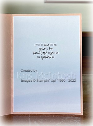 I attached the Petal Pink detailed oval to the embossed panel to the card front. The stamped oval panel is attached inside the Petal Pink frame. To decorate the inside of the card, I stamped one of the greetings from the Places in the Heart stamp set onto Basic White card using Memento Tuxedo Black ink. So simple, but I think it is pretty, don’t you?