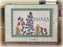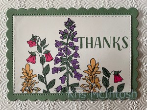 I coloured the image using the Dark Polished Pink, Dark Highland Heather, Light Soft Succulent and Light Pumpkin Pie Stampin’ Blends. I cut out the image using one of the Stitched Rectangle Dies and stamped “thanks” from one of the greetings in the Greatest Journey stamp set onto the right hand corner using Soft Succulent ink.