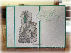 wonderful. Today’s card uses the In The Country stamp set, which is another stamp set you can earn for free during Sale-a-bration (4th January to 28th February 2023). I embossed Basic White card using the Timeworn Type 3D Embossing Folder and attached it to scored and folded Bermuda Bay card. I stamped the image from the In The Country stamp set onto Basic White card using Memento Tuxedo Black ink.