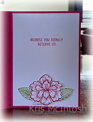 I stamped the large flower image twice onto Basic White card using Melon Mambo ink. I cut out one full flower and one centre of the flower and attached them together using dimensionals. The flower and leaves are attached over the embossed half of the card front. I stamped the greeting from the Charming Sentiments stamp set onto Basic White card using Melon Mambo ink. I used the co-ordinating Sentiment Silhouette Die to cut out the greeting before attaching it to the card front. To decorate the inside of the card I stamped the large flower onto Basic White card using Melon Mambo ink. I stamped two leaves onto Basic White card using Granny Apple Green ink. I cut out the flower and leaves and attached them to the bottom of Basic White card. I stamped another greeting from the Charming Sentiments stamp set onto the Basic White card using Melon Mambo ink.