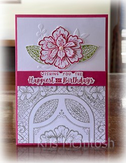 I stamped the large flower image twice onto Basic White card using Melon Mambo ink. I cut out one full flower and one centre of the flower and attached them together using dimensionals. The flower and leaves are attached over the embossed half of the card front. I stamped the greeting from the Charming Sentiments stamp set onto Basic White card using Melon Mambo ink. I used the co-ordinating Sentiment Silhouette Die to cut out the greeting before attaching it to the card front. To decorate the inside of the card I stamped the large flower onto Basic White card using Melon Mambo ink. I stamped two leaves onto Basic White card using Granny Apple Green ink. I cut out the flower and leaves and attached them to the bottom of Basic White card. I stamped another greeting from the Charming Sentiments stamp set onto the Basic White card using Melon Mambo ink.