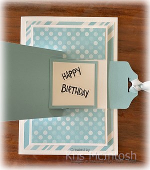 I stamped the greeting onto Basic White card using Memento Tuxedo Black ink and cut it out before attaching to the Basic White card. The ribbon on the pull mechanism is Balmy Blue & White 1/2″ Variegated Ribbon. I used the Fancy Tag Topper punch to create the place for the ribbon.