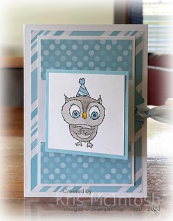 Today I have a card to share with you which I made for my great nephews birthday. I attached a piece of Dandy Designs 12″ x 12″ Designer Series Paper to the front of a Thick Basic White card base. I used Basic White and Balmy Blue card to create the pop-up mechanism following instructions I purchased from Elizabeth Shannon. I stamped the owl from the Adorable Owl stamp set onto Basic White card using Memento Tuxedo Black ink. I coloured the image using Gray Granite, Balmy Blue and Dark Daffodil Delight Stampin’ Blends. The greeting on the pop up comes from the Party Puffins stamp set.