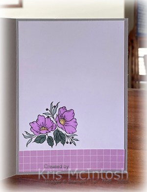 To decorate the inside of the card, I attached a narrow strip of Dandy Designs Designer Series Paper across the bottom of Basic White card. I stamped the image from the Framed Florets stamp set onto the lower left hand corner of the Basic White card using Memento Tuxedo Black ink. The image is coloured using the same Stampin’ Blends as the image on the front of the card. I really love how soft and pretty this card is, don’t you.