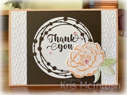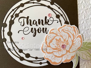 These folders are part of the Online Exclusive product and are sold as a set of three, all of which are absolutely lovely. The embossed Basic White panel is attached to scored and folded Petal Pink card. I cut a piece of Early Espresso card using the circle die from the Irresistible Blooms Dies. I attached the panel to Basic White card and stamped the greeting from the Irresistible Blooms stamp set inside the Early Espresso frame using Early Espresso ink. The panel is attached to the card front. I stamped the large flower from the Irresistible Blooms stamp set onto Basic White card using Petal Pink ink. I also stamped one of the leaf images from the same stamp set onto Basic White card using Soft Sea Foam ink.