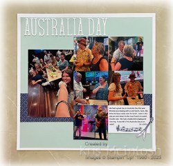 We celebrated with a lunch at home, followed by an afternoon visit to our local Tavern to watch a great band (Double Jack). For my page, I trimmed down a Pool Party 12″ x 12″ page and attached it to a Basic White 12″ x 12″ page. I added a strip of the now retired Dainty Flowers 12″ x 12″ Designer Series Paper across the lower part of the page before attaching my photos. I cut the title from Basic White card using the Alphabet A La Mode Dies and attached it across the top of the page.