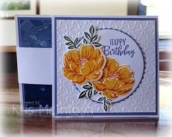 A few months ago I downloaded a free PDF from Lynn Dunn to create a Double Flap Fun Fold. I have never used the instructions until now. You can find Lynn’s blog post here. I don’t know why I waited so long to create this fun fold because it is simply amazing. I decided to use the Two Tone Flora Products to create my card today. I cut the card base and two folding flaps from Thick Basic White card. I attached the narrow folding flap to the card base. I attached a piece of Fancy Flora 6″ x 6″ Designer Series Paper to a piece of Orchid Oasis card and attached it to the card base, partially covering the narrow folding flap. I attached the large folding flap to the right hand side of the card base so that it covers the edge of the Designer Series Paper panel.