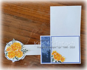 I cut two more circle from Basic White card using the largest circle from the Layering Circle Dies. I stamped the greeting from the Peaceful Moments stamp set using Orchid Oasis ink. I stamped two flowers and some leaves from the Two-Tone Flora stamp set using Daffodil Delight, Calypso Coral and Evening Evergreen ink. The images are cut out using the co-ordinating Two-Tone Flora Dies and layered onto the stamped circle. The stamped circle is attached to an Orchid Oasis scalloped circle before attaching the whole panel to the end of the narrow folding flap so that the images are centred onto the inside of the large folding flap. I stamped and cut various flower and leaf images from the Two-Tone Flora stamp set using the same inks as before. I layered the flowers and leaves onto the second Basic White circle before attaching it to the back of the Orchid Oasis scalloped circle. Finally I added some of the smaller flowers and leaves to the lower left hand corner of the inside of the large folding flap. Wow, isn’t this an amazing fancy fold! I can’t wait to make one using different stamp sets to get a totally different look.