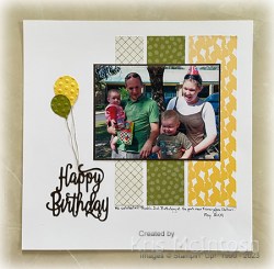 I punched Daffodil Delight and Old Olive card using the retired Balloon Builder Punch and embossed them using the polka dot folder from the Basics 3D Embossing Folders. I attached a length of Linen Thread to the back of the balloons before attaching them to the left hand side of the page. I cut Early Espresso card using the long retired Happy Birthday Thinlit Die and attached it to lower left hand corner of the page making sure that it sat over the ends of the linen thread. I hand wrote my story using a Journaling pen that Stampin’ Up! used to sell. Such a fun page. This designer series paper is really lovely and will be retiring at the end of April when the next Annual Catalogue is released, so don’t delay placing your qualifying order to receive this gorgeous paper.