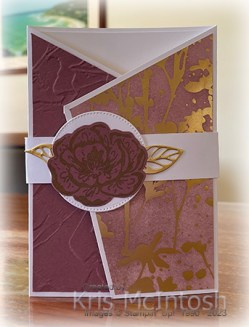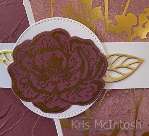 I attached the circle to the belly band so that it covered the join. I stamped the flower from the Irresistible Blooms stamp set onto Moody Mauve card using Versamark ink. I sprinkled the image with gold embossing powder and heat set it. I cut out the flower using the co-ordinating Irresistible Blooms Dies I die cut two different leaves from Gold Foil card using the Irresistible Blooms Dies. I attached the leaves and flower to the belly band. I love this card and I know that my Mum did too. So thank you Tami for being so generous and sharing your instructions.