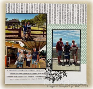 Today’s page shows off some photos from our holiday to Toowoomba with Mum and Dad. I attached two different patterns from the retired Pattern Party 12″ x 12″ Designer Series Paper to Basic White 12″ x 12″ pages. I made sure that the patterns matched across the centre with the black and white pattern on the bottom of the first page and on the top of the second page.