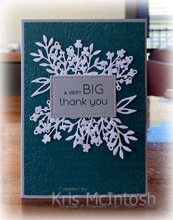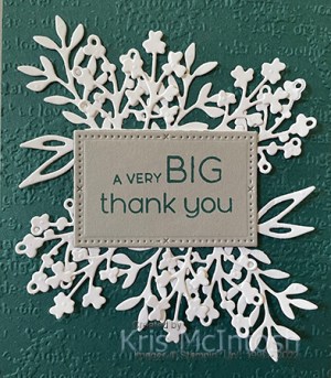 I layered one each of the three different dies together to create two banners. I stamped “a very Big” and “thank you” greetings from the Timeless Arrangements stamp set onto Smoky Slate card using Pretty Peacock ink. I cut out the greetings using one of the dies from the Timeless Arrangements Dies.