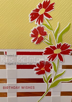 This week in my Facebook Live, I shared some cards I made using the fun Lattice technique. Today I have another card to share with you. For this card, I cut my card base from Thick Basic White card. After attaching the narrow strips to the card front, I embossed a piece of Lemon Lolly card using one of the Basics 3D Embossing Folders and attached it to the top panel on the card front. I stamped two of the large flower stems from the Sending Smiles stamp set onto Basic White card using Lemon Lime Twist ink.