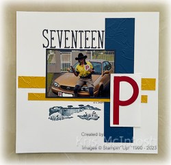 Today’s page showcases the photo that Ethan sent to me after he got his “P” plates.. I embossed a piece of Blueberry Bushell card using the Painted Texture 3D Embossing Folder and attached it to the right hand side of a Basic White 12″ x 12″ page. I cut two strips of Crushed Curry card, embossed them using the same embossing folder and attached them across the page. I attached my photo to Night of Navy card before attaching it to the page.