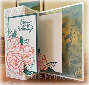 My youngest daughter recently celebrated her birthday and today I am going to share with you the card I made for her. I followed some instructions shared by Susan Campfield on You Tube to create this Double Decker Pop Out card. I cut my card base from Thick Basic White card and attached a piece of Hello, Irresistible 6″ x 6″ Designer Series Paper onto the inside. I embossed Basic White card using one of the folders from the Basics 3D Embossing Folders and attached one each to the smaller panels. I stamped the smaller flower from the Irresistible Blooms stamp set onto the lower left hand corner of Basic White card using Flirty Flamingo.