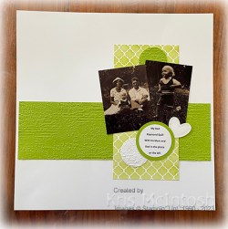 Today I have a couple of photos of my Dad when he was only little. One picture with his Mum and Dad and the second a little older. Not sure exactly when or where these photos were taken. I embossed a panel of Granny Apple Green card using the Exposed Brick 3D Embossing Folder and attached it across a Basic White 12″ x 12″ page. I used one of the Artistic Mix Decorative Masks to add Granny Apple Green ink to a piece of Basic White card using a Blending Brush. I attached the sponged card to the right hand side of the page.