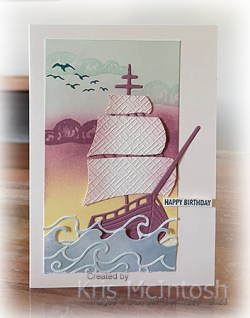I die cut a panel of the Hello, Irresistible 6″ x 6″ Designer Series Paper using the On The Ocean Dies three times to create the ocean. I also cut Moody Mauve card using the die for the boat and also the sail/mast from the On The Ocean Dies. I attached the boat die cut to the coloured panel with the ocean panels over the top. I die cut the sails from Very Vanilla card using the On The Ocean Die and embossed the panel using one of the Basics 3D Embossing Folders. I added a little Pecan Pie ink to the sails before cutting them apart. I attached them to the sail/mast die cut before attaching the panel to the card front. I stamped the bird image from the On The Ocean stamp set onto the card front using Pretty Peacock ink.