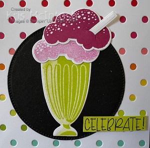 I stamped “celebrate” from the Share A Milkshake stamp set onto Lemon Lime Twist card using Memento Tuxedo Black ink. I cut out the greeting using my paper snips and attached it to the card front using dimensionals. To decorate the inside of the card, I created a narrow strip of Basic White card cut using the Dots and Spots Die with two strips of Bright collection card behind it. I added a narrow strip of Basic Black behind one long edge before attaching the panel across the bottom of Basic White card. I stamped “happy birthday” from the Enjoy The Rhythm stamp set onto the Basic White card using Memento Tuxedo Black ink. I added the cherry image from the Share A Milkshake stamp set beside the greeting using Berry Burst ink.