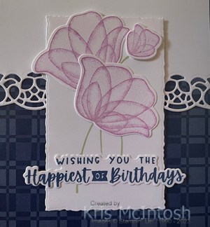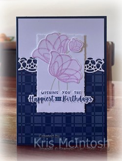 This week in my Facebook Live I shared some cards I created using the Translucent Floral Bundle. Today I have another card to share, although I created this card some time back for a friend who celebrated her birthday (sorry it was late). I attached a piece of Delightfully Eclectic 12″ x 12″ Designer Series Paper to a scored and folded Night of Navy card base. I die cut a piece of Basic White card using the Elegant Border Dies and attached it to the top half of the Designer Series paper. I die cut Basic White card using one of the Deckled Rectangle Dies.
