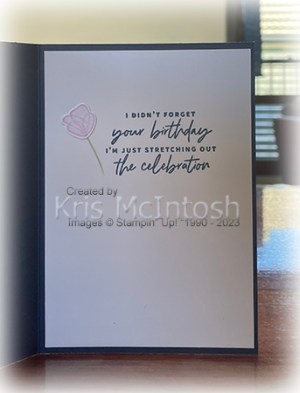 I die cut the flowers using the co-ordinating Translucent Floral Dies. I attached the flowers to the flower stems using a dimensional under the small flower. I attached the panel to the card front using dimensionals. I stamped the greeting from the Charming Sentiments stamp set onto Basic White card using Night of Navy ink. I cut out the greeting using the co-ordinating Sentiment Silhouette Die and attached it across the stamped rectangle. I stamped a greeting from the Something Fancy stamp set onto Basic White card using Night of Navy ink. I stamped the flower stem image from the Translucent Floral stamp set beside the greeting, although I only inked about half the stem. I stamped and die cut a small flower as I did for the card front and attached it to the top of the flower stem. I love how soft and pretty this card is and hope that my friend loved it too.