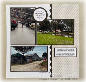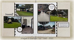Last March, Ron and I did a small road trip with our friends and our first stop was Inverell. We have driven through this town many times so it was nice to spend some time there and look around. For my page I cut a piece of Early Espresso card in half using one of the Basic Border Dies. I attached the die cuts to one long edge of two pieces of retired In Good Taste Designer Series Paper. The panels are attached to the outside edges of two Basic White 12″ x 12″ pages.