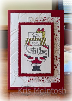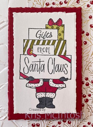 Today’s card is another one I created using the Gift of Giving stamp set from the September to December Mini Catalogue. For this card I embossed a piece of Basic White card using the Painted Texture 3D Embossing Folder and attached it to the left hand side of a Cherry Cobbler card front. I also attached a piece of the Joyful 12″ x 12″ Specialty Designer Series Paper to the right hand side of the card front overlapping the embossed card. I die cut Cherry Cobbler card using one of the Deckled Rectangle Dies and attached it to the card front using dimensionals.