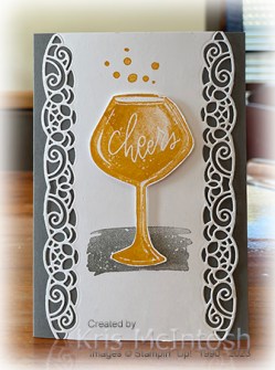 Today’s card uses the Cheers to the Season stamp set which I shared on my Facebook Live this week. I decided to create New Year card which is perhaps a little early but I am sure I will find a good use for it. I cut both sides of a piece of Basic White card using one of the Elegant Border Dies. I stamped the background image from the Cheers to the Season stamp set onto the Basic White card using Basic Gray ink. I stamped the glass image from the Cheers to the Season stamp set onto Basic White card using Crushed Curry ink and cut it out.