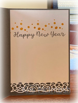 To decorate the inside of the card, I cut the bottom edge of a piece of Basic White card using the same die from the Elegant Border Dies. I stamped the greeting from the Year to Celebrate stamp set across the upper part of Basic White card using Basic Gray ink. I stamped the bubble image from the Cheers to the Season stamp set above the greeting using Crushed Curry ink.