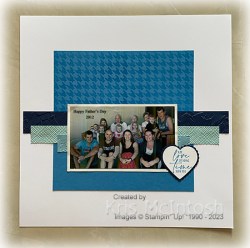 I embossed a strip of Pool Party card using one of the folders from the Basics 3D Embossing Folders and attached it across the bottom of the Night of Navy card. I embossed a strip of Balmy Blue card using the splatter folder from the Stripes & Splatters 3D Embossing Folders and attached it across the bottom of the Pool Party card. I attached my photo over the top. I stamped the greeting from the So Sincere stamp set onto Basic White card using Azure Afternoon ink and punched it out using the plain heart from the now retired Heart Punch Pack. I punched Night of Navy card using the scalloped heart from the Heart Punch Pack and attached the two hearts together. The greeting is attached to the bottom right hand corner of the photo. I love how happy this page makes me feel. So lucky to have my family living so close.