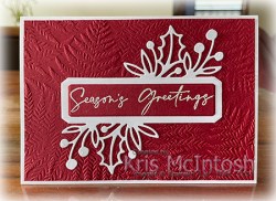 I cut Basic White card using the decorative banner die from the Christmas Classics Dies. I attached the die cut to the centre of the embossed Cherry Cobbler card. I cut Cherry Cobbler card using the smaller banner die from the Christmas Classics Dies. I stamped the greeting from the Christmas Classics stamp set onto the Cherry Cobbler banner using Versamark ink.