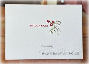 I sprinkled the greeting with White Embossing Powder and heat set it. The greeting is attached to the centre of the Basic White banner. To decorate the inside of the card, I stamped the holly leaves from the Christmas Classics Bundle using Old Olive ink. I stamped another greeting from the Christmas Classics stamp set and the berry image using Cherry Cobbler ink. I decided that I should create another card this time using Old Olive card to emboss and stamp on.