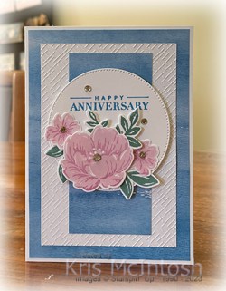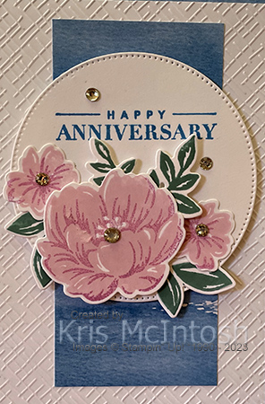 My Mum and Dad recently celebrated their 69th Wedding Anniversary. Such an amazing feat! So I had to create a special card for them and this is what I decided on. I found a card sketch on Pinterest and used it as a guide. I attached a piece of Bright & Beautiful 6″ x 6″ Designer Series Paper to scored and folded Thick Basic White card. I embossed a panel of Basic White using one of the folders from the Basics 3D Embossing Folders and attached it to the centre of the Designer Series Paper. I cut down the remaining piece of Designer Series Paper and attached it to the centre of the embossed card. I cut Basic White card using the largest circle from the Stylish Shapes Dies and stamped the greeting from the retired Celebrating You stamp set using Azure Afternoon ink.