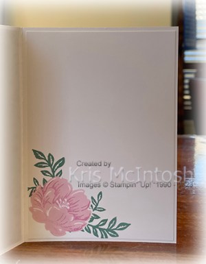 Lastly I added several Basic Rhinestones to the flowers and the stamped circle. To decorate the inside of the card, I stamped the large solid flower from the Two-Tone Flora stamp set onto the lower left hand corner of Basic White card using Bubble Bath ink. I stamped the detailed image over the top using Fresh Freesia ink. I covered the flower with a mask and stamped the multi leaf image from the Two-Tone Flora stamp set twice using Lost Lagoon ink. The stamped panel is attached to the inside of the card.