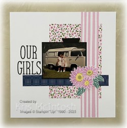 Today’s page displays a photo of my two girls taken at my husbands parent’s home in Moree many years ago. I attached a piece of Delightfully Eclectic 12″ x 12″ Designer Series Paper onto a Basic White 12″ x 12″ page. I attached another piece of Delightfully Eclectic Designer Series Paper down the right hand side of the page and another piece horizontally across the page. I attached my photo to Basic Black card and attached it to the page so that I could slide my journalling behind the photo.