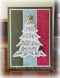 I also attached the Mossy Meadow Designer Series Paper across the bottom of the stamped panel. I had some more pieces left so this time I attached the Basic White card to scored and folded Real Red card. I stamped the image from the Cheers to the Season stamp set onto Basic White card using Real Red ink and cut it out using one of the Deckled Circle Dies.