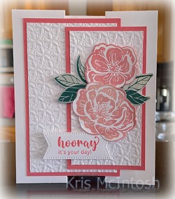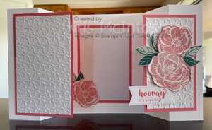 it’s your day! Today I am sharing a card I made for a very dear friend following the instructions by Terri Gaines. Terri very generously shares her dimensions and also has a video to watch how to assemble the card. I cut my card base from Thick Basic White. I attached a piece of Basic White card to Flirty Flamingo card and attached it to the inside panel. I cut a flower from the Hello, Irresistible 6″ x 6″ Designer Series Paper using the co-ordinating Irresistible Blooms Die and attached it to the lower left hand corner.