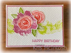 The stamped panel is embossed using one of the folders from the Basics 3D Embossing Folders before being attached to Berry Burst card (5-3/8″ x 3-7/8″) and then the top of the box. I stamped one large flower from the Artistically Inked stamp set onto Basic White card using Berry Burst ink and two smaller flowers using Poppy Parade ink. I also stamped the double leaf image from the Artistically Inked stamp set onto Basic White card using Granny Apple Green ink. I cut out the flowers and leaf using the co-ordinating Artistic Dies. The flowers and leaves are layered together onto the upper left hand corner of the embossed Basic White card.