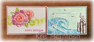 I used a Blending Brush to add Coastal Cabana ink over the masked images and the stamped wave. I removed the masks and added a little more Coastal Cabana ink over the clouds. I stamped the greeting from the Waves of Inspiration stamp set using Azure Afternoon ink. I also stamped three of the bird images from the same stamp set using Early Espresso ink. The stamped panel is attached to Azure Afternoon card and then the top of the box.