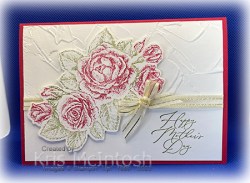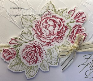 I embossed the top portion of this panel using the Painted Texture 3D Embossing Folder. I wrapped the bottom edge of the embossing using the Gold & Vanilla Satin Edge Ribbon. I stamped the greeting from the Stippled Roses stamp set onto the lower right hand corner of the Basic White card using Old Olive ink. The whole panel is attached to scored and folded Real Red card. I inked the large rose bouquet from the Stippled Roses stamp set using an Old Olive and Real Red Stampin’ Write Marker and stamped onto Basic White card