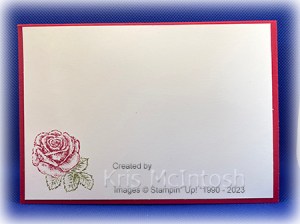 I used the co-ordinating Stippled Roses Die to cut out the flower. I attached the flower to the card front using dimensionals. I tied a bow in a length of the Satin Edge Ribbon and attached it to the card front using a Glue Dot. To decorate the inside of the card, I inked the small rose using the same Stampin’ Write Markers and stamped onto the lower left hand corner of Basic White card.