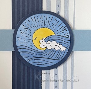 The Basic White panel is attached to scored and folded Night of Navy card. I stamped the wave image from the Circle Sayings stamp set onto Basic White card using Memento Tuxedo Black ink and coloured it using Boho Blue and Light Daffodil Delight Stampin’ Blends.