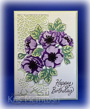 This week in my Facebook Live, I shared some cards I created using this amazing bundle. You get a stamp set, co-ordinating dies and a set of decorative masks in this bundle, which gives lots of options for creating. For today’s card I used one of the Radiating Stitches Dies to cut a window down the left hand side of Basic White card. I stamped the “happy birthday” from the Beautiful Balloons stamp set onto the lower right hand corner of the panel using Gorgeous Grape ink