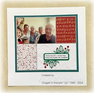 2023. Over the past couple of years we have been celebrating Christmas Day with my Mum and Dad, my sister, her daughter and grandson. Quiet but lovely just the same. I embossed Basic White card using the Painted Texture 3D Embossing Folder. I attached my photo, the embossed Basic White card and two pieces of the now retired Joyful 12″ x 12″ Specialty Paper to Smoky Slate card. I attached the whole panel to Shaded Spruce card and then to a Basic White 12″ x12″ page. I used the Christmas Classic Die to cut Shaded Spruce and Cherry Cobbler card. I cut the berries from the Cherry Cobbler card and attached them to the Shaded Spruce die cut. I attached the die to the embossed Basic White panel. I printed my journaling onto Basic White card and cut it out using the Christmas Classic Die. The journaling is attached to the centre of the Shaded Spruce die cut. Another simple page and I am not sure that the photo is that great but it is certainly better than any selphie I can take! Unfortunately the Designer Series Paper and the Christmas Class Dies are now retired but I am sure many of you will have these products in your stash.