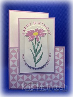 This week in my Facebook Live I shared some cards I made using the Filled With Happiness stamp set which you can find in the new Mini Catalogue. I cut my card base from Fresh Freesia card and then trimmed down the front panel. I attached a piece of Delightfully Eclectic 12″ x 12″ Designer Series Paper to the front panel. I stamped the top half of the Happy Birthday image from the Filled with Happiness stamp set onto the top of a piece of Basic White card using Fresh Freesia ink.