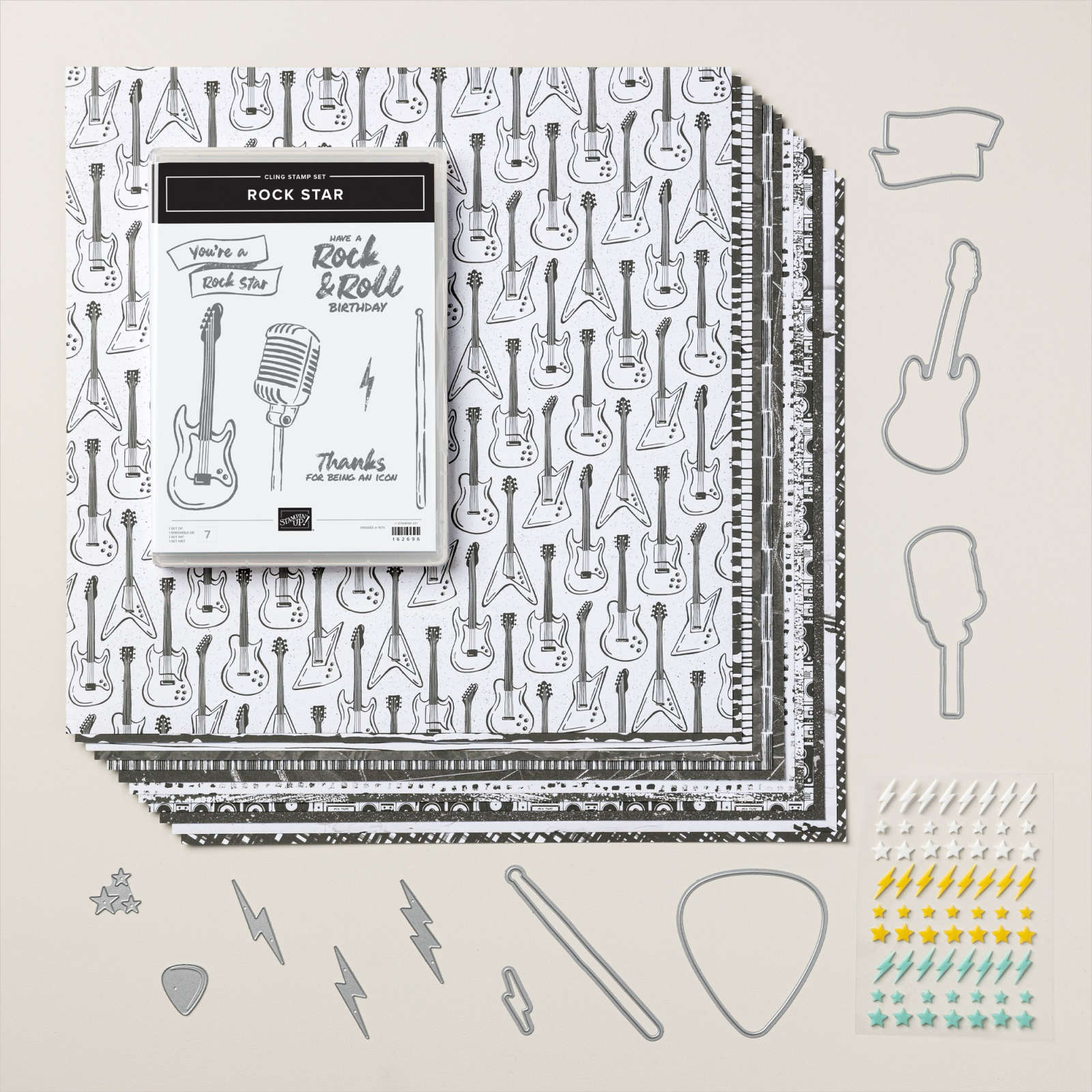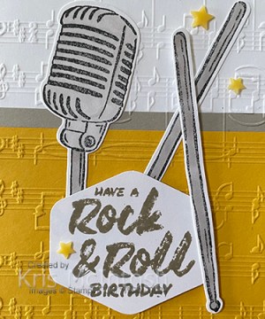 This week in my Facebook Live I shared some cards using the Rock Star Collection. This collection includes the Rock Star Bundle, Rock & Roll 12″ x 12″ Designer Series Paper and Adhesive Backed Lightning & Stars. For today’s card, I attached Crushed Curry card across the bottom of a Basic White panel and added a narrow strip of Gray Granite card across the top. I embossed the whole panel using the Merry Melody 3D Embossing Folder before attaching the panel to scored and folded Gray Granite card. I stamped the microphone image from the Rock Star stamp set onto Basic White card using Memento Tuxedo Black ink.